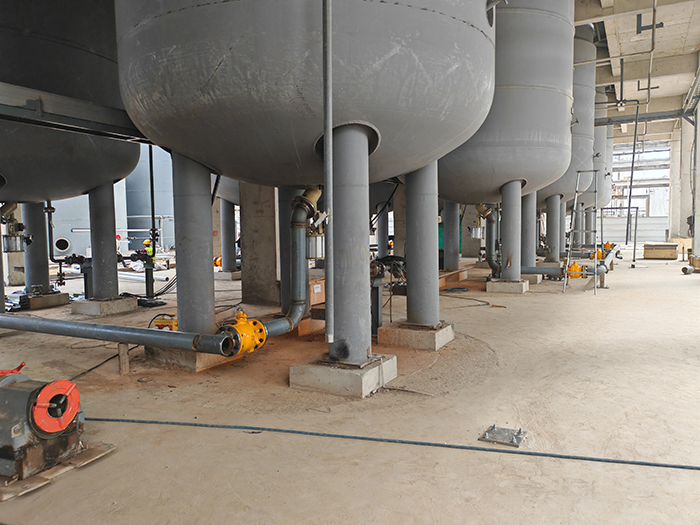 此外,硫化尾氣風(fēng)機(jī)已經(jīng)順利就位,并正在加緊安裝。風(fēng)機(jī)的安裝過(guò)程涉及精確的調(diào)試和校準(zhǔn)工作,施工人員根據(jù)設(shè)計(jì)要求,對(duì)風(fēng)機(jī)的水平度、垂直度等關(guān)鍵參數(shù)進(jìn)行嚴(yán)格控制,以確保風(fēng)機(jī)能夠正常運(yùn)行。 罐體制作情況 多硫化儲(chǔ)罐、三效工藝水儲(chǔ)罐、火堿儲(chǔ)罐和中和水儲(chǔ)罐等關(guān)鍵設(shè)備已經(jīng)制作完成。在設(shè)備制作過(guò)程中,公司嚴(yán)格按照相關(guān)的質(zhì)量標(biāo)準(zhǔn)和設(shè)計(jì)規(guī)范進(jìn)行生產(chǎn)。選用了優(yōu)質(zhì)的鋼材作為原材料,經(jīng)過(guò)下料、焊接、成型等多道工序,確保了罐體的強(qiáng)度和密封性。 精制、水洗、打漿、多硫化工序 精制、水洗、打漿、多硫化工序相關(guān)的管道和閥門(mén)正在緊鑼密鼓地進(jìn)行安裝。在管道安裝過(guò)程中,嚴(yán)格按照工藝流程進(jìn)行布置,確保物料流動(dòng)順暢。同時(shí),對(duì)閥門(mén)進(jìn)行嚴(yán)格的質(zhì)量檢驗(yàn)和調(diào)試,保證閥門(mén)的開(kāi)閉靈活、密封性能良好。目前已完成大部分管道和閥門(mén)的基礎(chǔ)安裝工作。
